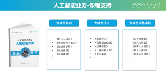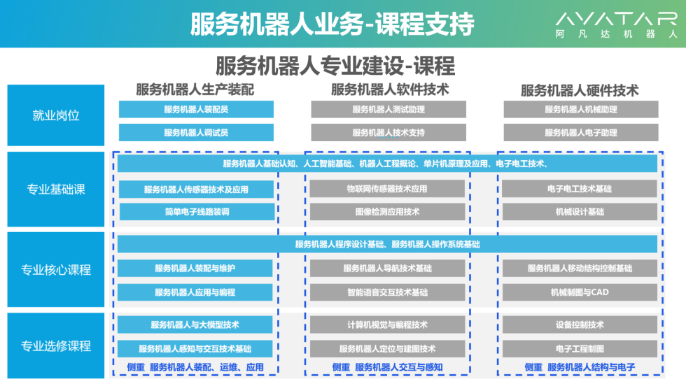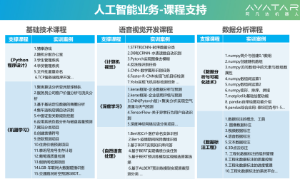 课程体系:阿凡达机器人就高职高校人工智能教育开设“人工智能”和“服务机器人”两大专业方向,搭建实践应用课程体系,不仅培训学生理论知识,更着重培养其应用实践创新能力,并通过行业岗位技能实际需求,培养学生未来职业竞争力;