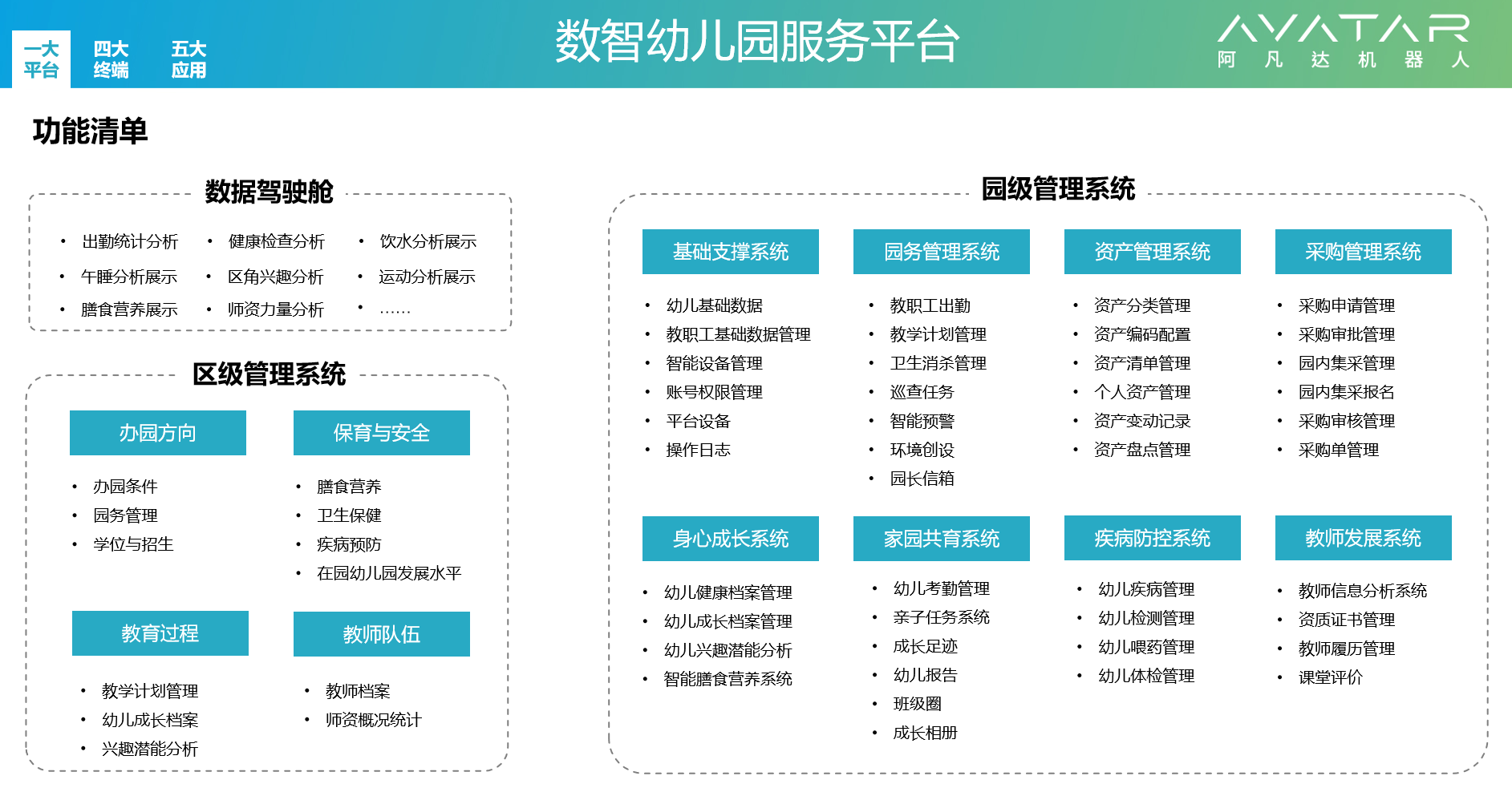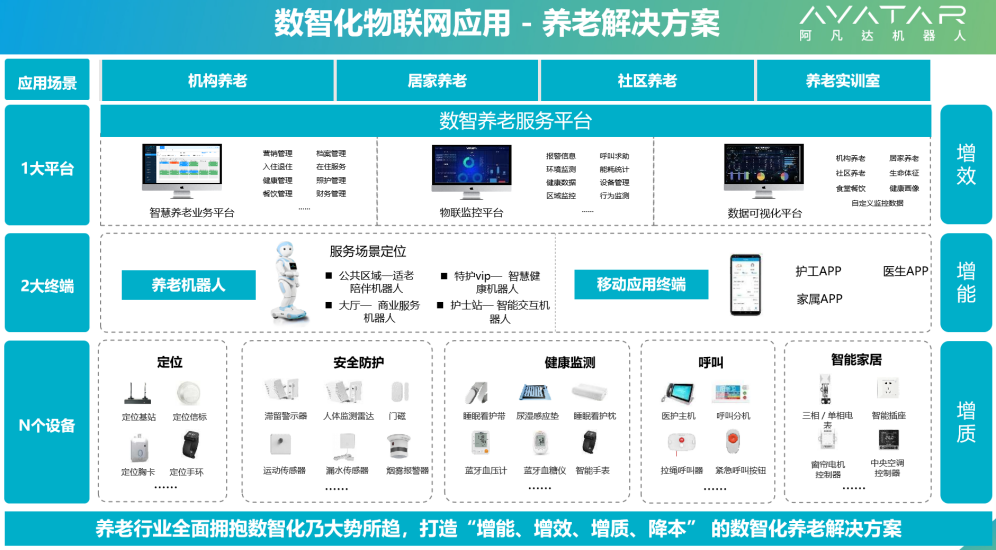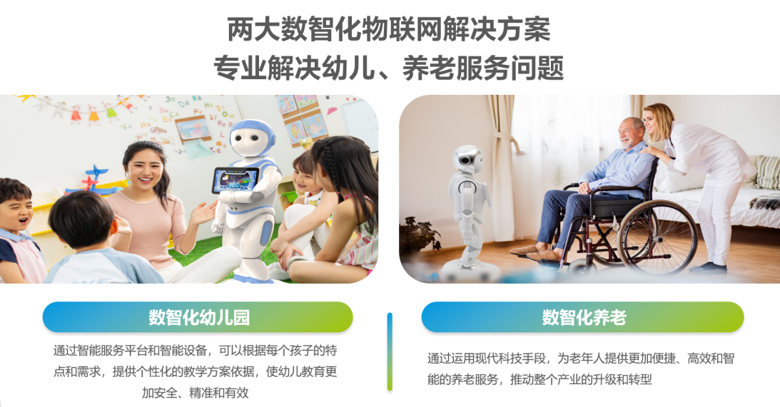 阿凡达机器人数智化物联网板块业务主要有“数智化幼儿园”和“数智化养老”两大解决方案,利用先进智能科技设备、搭配智慧平台,赋能幼儿园区管理和养老服务。