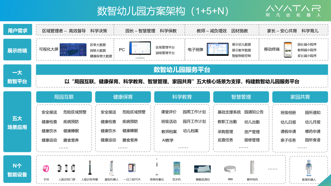 阿凡达机器人深入实践“幼儿发展优先”的核心理念,构建“1大数智平台+5大场景应用+4大展示终端”完整解决方案,使幼儿教育更加安全、精准和有效。目前已与无极县多所幼儿园展开深度合作;