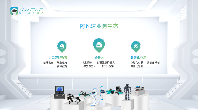 阿凡达机器人科技有限公司作为领先的人工智能和机器人解决方案提供商,从人工智能机器人研发开始,逐步把机器人应用到各个场景中,逐渐衍生出机器人、人工智能教育、数智化应用三大板块业务,除了对机器人本身的应用和资源不断完善去匹配场景需求外,更针对各领域需求进一步的产品线扩展,形成更全面的产品矩阵及各领域的整体解决方案。